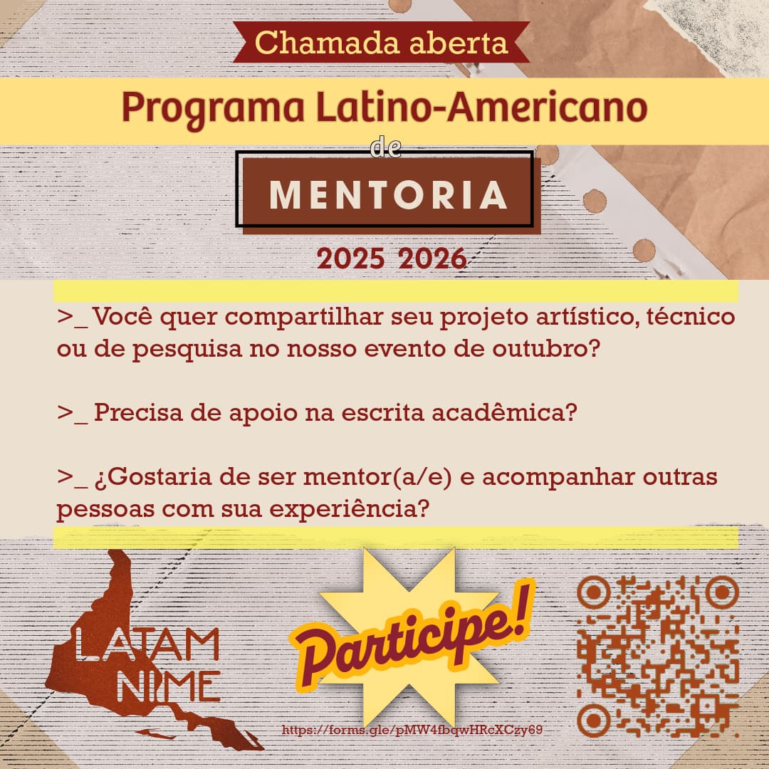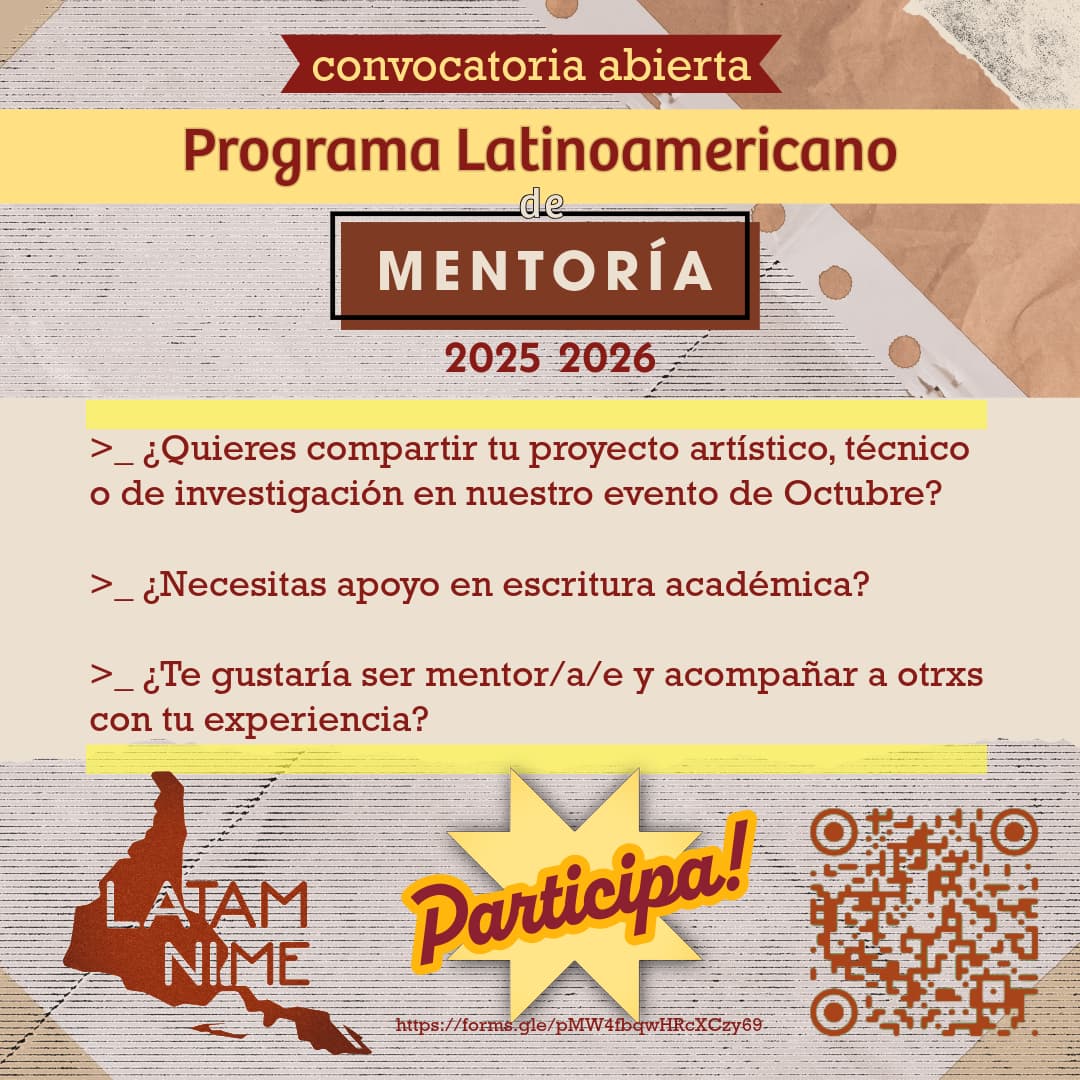 Como parte da nossa rede LATAM NIME, estamos organizando um evento virtual em outubro para compartilhar projetos artísticos, técnicos e de pesquisa dentro da nossa comunidade.